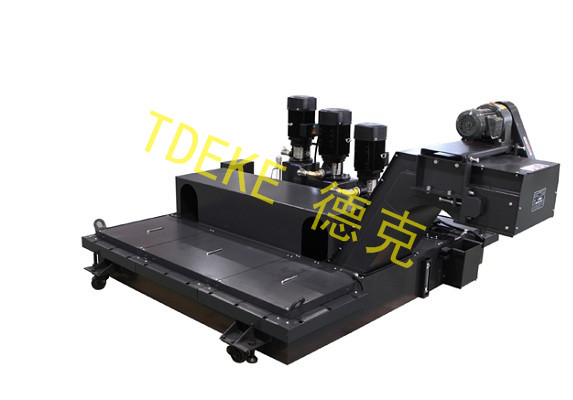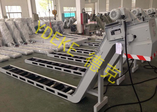 刮板排屑机在从水箱中刮排切屑时,可选加时间继电器使减速电机间断工作以便控水,可在刮板排屑机底层选加磁铁以加速铁屑沉淀,还可选加制冷机控制冷却液温度。
